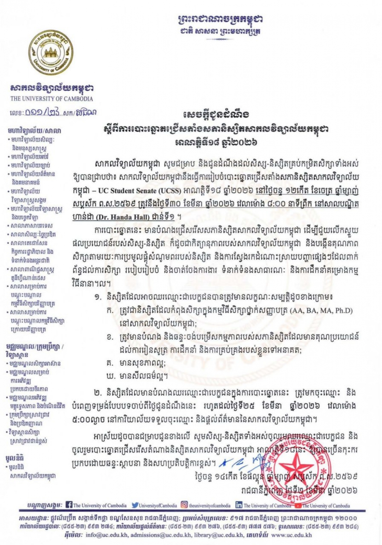សេចក្តីជូនដំណឹងស្តីពីការបោះឆ្នោតជ្រើសតាំងសភានិស្សិតសាកលវិទ្យាល័យកម្ពុជាអាណត្តិទី១៨ ឆ្នាំ២០២៦